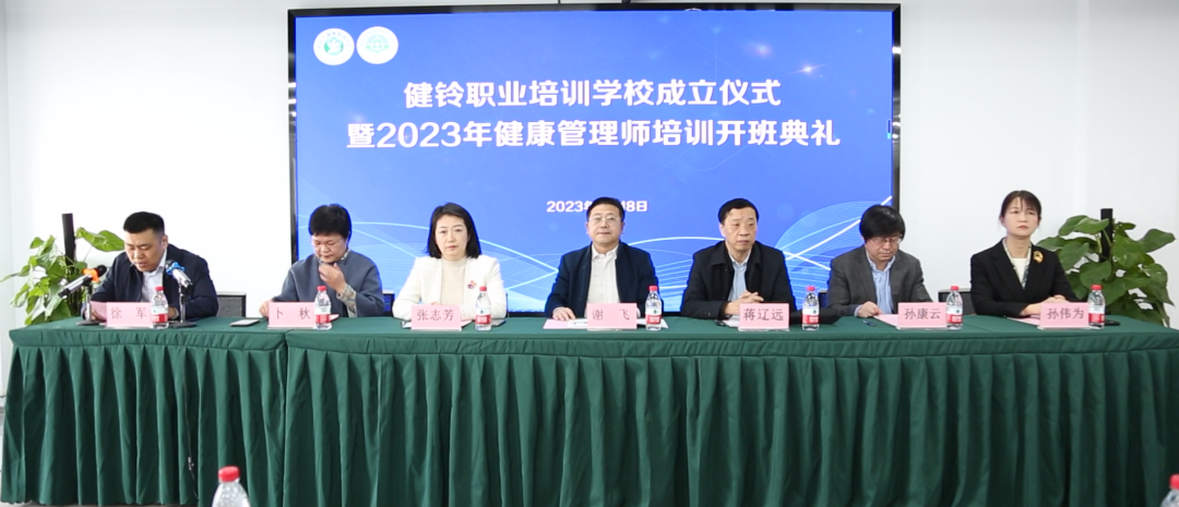 成立仪式上,苏州市健康管理学会会长孙康云首先致欢迎辞,并介绍了学校成立的背景,希望学校能够尽快在纷杂的市场环境中找准自身定位,取得健康持久发展。紧接着,相城区卫健委主任孙伟为对学校顺利成立表示热烈祝贺,对学校未来发展提出殷切希望,对健康管理师培训班的参训学员作出了鼓励和要求。随后,江苏省预防医学会秘书长蒋辽远充分肯定了苏州市健康管理学会在健康管理师培训方面作出的成绩,并希望健铃培训学校在二级健康管理师、老年人能力评估师、社群健康助理员和助听器验配师等工种培训方面多动脑筋,争取取得培训考核资质,多为社会培养人才。然后,苏州市卫生健康委员会副主任张志芳从国家政策大环境和苏州医疗健康小环境出发,为我们详细分析了职业教育,并希望学校要提高政治站位,坚守育人初心不动摇;要提升办学质量,紧抓教学核心竞争力;要提振教育能级,打造“健铃”品牌影响力。 最后,苏州市政府副秘书长谢飞、江苏省预防医学会秘书长蒋辽远、苏州市卫健委副主任张志芳、苏州市卫健委一级调研员卜秋、苏州市健康管理学会会长孙康云、苏州市医保局副局长徐军、相城区卫健委主任孙伟为共同为学校成立揭牌。