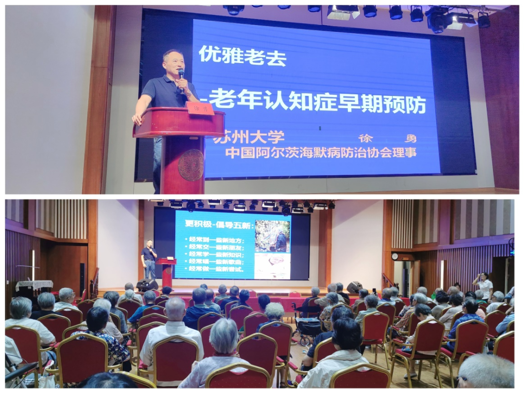 简短的开场仪式后,苏州大学卫生发展研究中心主任,市健康管理学会副会长徐勇教授为大家带来了“优雅老去--老年痴呆早期预防”的健康科普讲座,随着老龄化的不断加剧,阿尔茨海默病正在成为全球最主要的疾病与死亡负担之一,2024年9月21日是第31个“世界阿尔茨海默病日”,今年的宣传主题是:“即刻行动,点亮记忆之光”。徐教授从“什么是老年痴呆?如何早期发现、早期预防?”三个问题开始,语重心长地为大家解析了老年痴呆的可能发生原因,用生动丰富的案例,并结合自己多年研究的成果,提出了每天“五个一”的预防措施,即“每天一个小时锻炼,一个小时手指训练,一个小时邻里交谈,一个小时读书计算,每天一份营养菜单”;简洁明了、通俗易懂的讲解,赢得在场老年朋友们的共鸣和掌声。