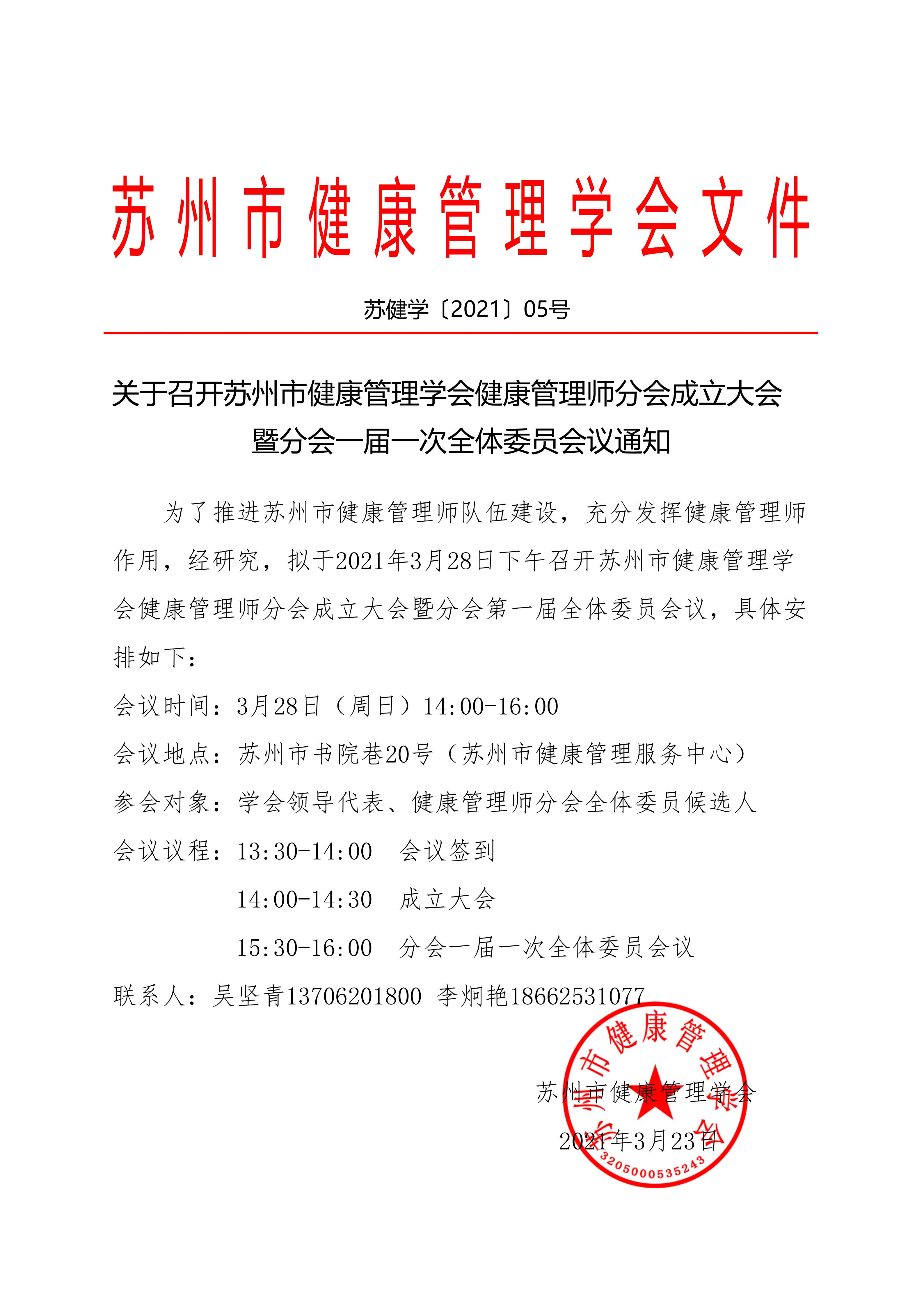 关于召开苏州市健康管理学会健康管理师分会成立大会 暨分会一届一次全体委员会议通知